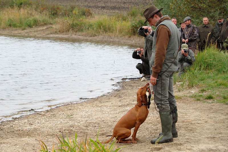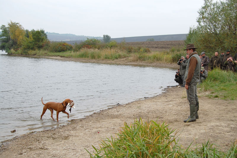 Divácky velmi atraktivní byly i disciplíny při práci na vodě u rybníka v Těšanech. Lovečtí psi přinášeli kachnu z hluboké vody, hodnotila se jejich ochota k práci, ale i dohledávka a nahánění kachny v rákosí.