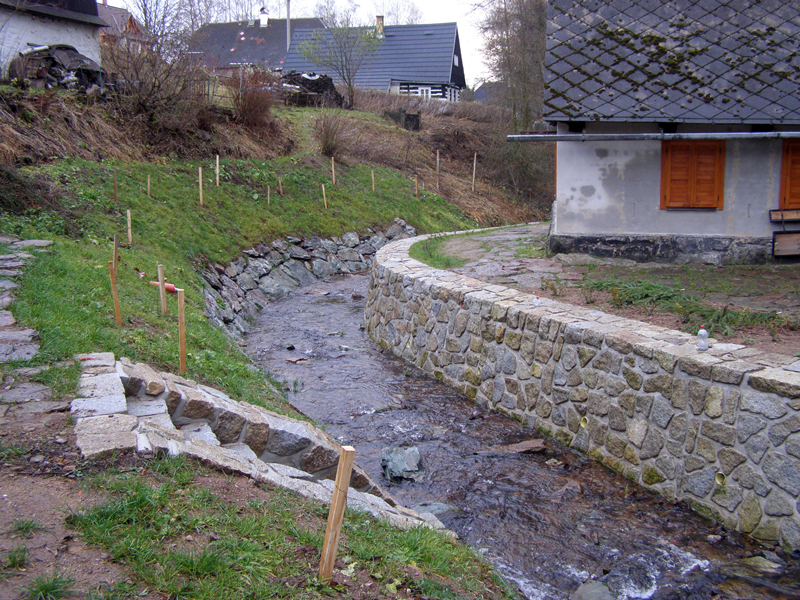 Projektová dokumentace řešila stabilizaci a zkapacitnění tří vytypovaných úseků koryta vodního toku na ochranu obytných nemovitostí. Zkapacitnění toku bylo navrženo na Q20 tedy dvacetiletou vodu s průtokem 16,2m3/s. Stavební úseky byly voleny relativně krátké 50, 30 a 30 m a užití stavebních technologií a materiálů (kamenné zdi, kamenné rovnaniny, příčné pasy z odkorněné kulatiny) bylo akceptováno příslušnými orgány ochrany přírody.