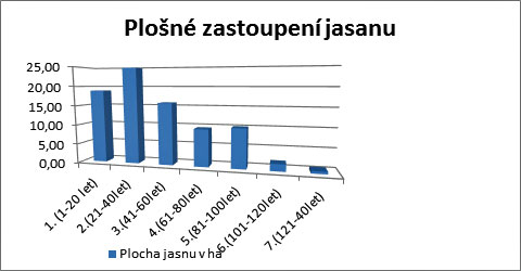 Z grafu lze vidět plošné zastoupení jasanu v jednotlivých věkových třídách. První věková třída je na revíru Bílý Vlk z přirozené obnovy a jasan zde tvoří monokultury, tudíž po uhynutí jasanu budeme nuceni vzniklé holiny zalesnit. Porosty v druhé věkové třídě byly z 80 % založeny uměle a byly vytvořeny monokultury, které se již nyní rozpadají a během několika let bude potřeba dané porosty dotěžit a opět zalesnit, ale již vhodnější druhovou skladbou. Zbylých 20 % jasanu v druhé věkové třídě tvoří pouze příměs ve smíšených porostech, takže po uhynutí jejich místo v porostu nahradí habry, lípy a javory. Jasany ve třetí a čtvrté věkové třídě tvoří příměs ostatních listnáčů a po uhynutí a vytěžení nebudou vznikat holiny, ale budeme mít na revíru rozvolněné porosty, což není žádoucí, ale na druhé straně je to menší zlo než holiny. Porosty věkové třídy pět a více jsou již starší 80 let a tudíž v nich může probíhat mýtní těžba.