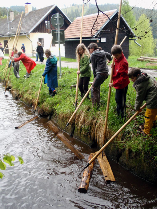 Na Jeleních Vrších, uprostřed Národního parku Šumava, pro ně ukázku nachystal správce toků Hynek Hladík ze státního podniku Lesy České republiky. Děti však musely jet napřed vláčkem ze Stožce do Nové Pece a potom osm kilometrů pěšky na Jelení Vrchy.