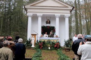 Po úvodním srdečném přivítání návštěvníků panem lesním správcem Ing. Romanem Křivánkem následovala vlastní mše, kterou sloužil vranovský kněz, otec Marek Dunda. Ve svém poutavém kázání připomněl některé momenty ze života svatého Huberta a odkaz tohoto světce, jež svými činy přesahuje až do dnešní doby. Zadumaný podzimní les rozezvučeli Lukovští trubači a Želetavský smíšený pěvecký sbor. Před slavnostně vyzdobenou kaplí se sešlo přes 250 lidí, což je dvakrát více než v loňském roce.