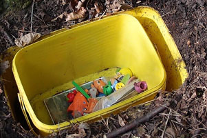 Do něčeho jsem šlápl. Stalo se mi to při vyznačování těžby – koukám do korun stromů a pořádně nesleduji terén pod sebou. Noha se mi kamsi propadla a mé tělo udělalo ukázkový para kotoul. Ani jsem nestačil zaklít. Co to bylo? Na místě činu jsem z jamky pod hrabankou vytáhl jakousi plastovou krabici plnou hraček z „Kinder“ vajíček, odznaků a jednoho deníčku s tužkou. Na vyhozený odpad v lese to ale nevypadalo, tomu neodpovídal charakter obsahu i způsob zamaskování. Třeba napoví přiložený deníček. V něm byly jen krátké zápisky ve stylu datum a poděkování za jakousi keš, přitom poslední zápis je ze včerejšího dne. Skrýš je zřejmě hojně navštěvovaná, svědčí o tom i ta vyšlapaná stezka k ní.