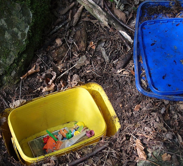 Do něčeho jsem šlápl. Stalo se mi to při vyznačování těžby – koukám do korun stromů a pořádně nesleduji terén pod sebou. Noha se mi kamsi propadla a mé tělo udělalo ukázkový para kotoul. Ani jsem nestačil zaklít. Co to bylo? Na místě činu jsem z jamky pod hrabankou vytáhl jakousi plastovou krabici plnou hraček z „Kinder“ vajíček, odznaků a jednoho deníčku s tužkou. Na vyhozený odpad v lese to ale nevypadalo, tomu neodpovídal charakter obsahu i způsob zamaskování. Třeba napoví přiložený deníček. V něm byly jen krátké zápisky ve stylu datum a poděkování za jakousi keš, přitom poslední zápis je ze včerejšího dne. Skrýš je zřejmě hojně navštěvovaná, svědčí o tom i ta vyšlapaná stezka k ní.