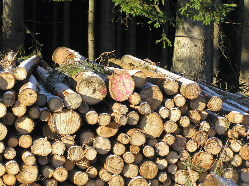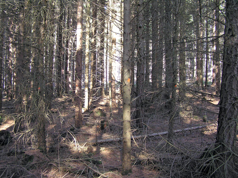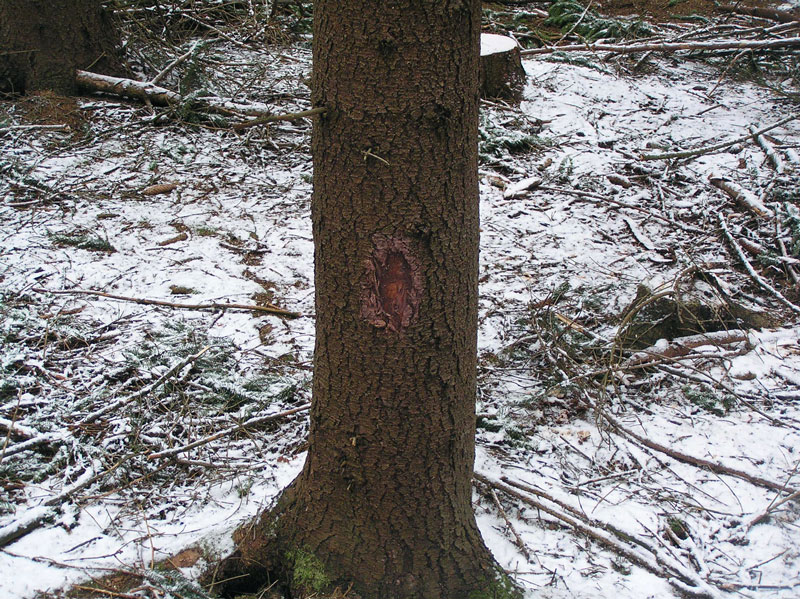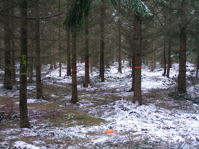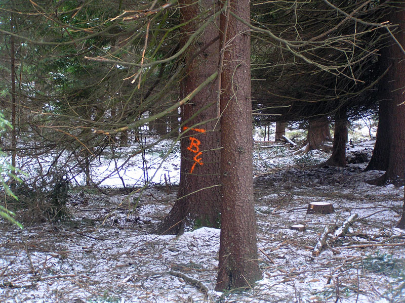 Dalším bodem je příprava porostů. Zcela zásadní je řádné vyznačení zásahu /obr.1/. (Většina operátorů tvrdí: „že už to mají v oku“, ale co si budeme povídat, silnější stromy vždy lákají). Stromy vyznačuji ze dvou stran, a to kolmo na probíhající linky. Linky vyznačuji těsně před zásahem poté, co si porosty projdu s operátorem a dozvím se jeho připomínky. Není špatné znát technické parametry a možnosti daného stroje. Dále je potřeba od sebe barevně oddělit jednotlivé porostní skupiny, aby nedocházelo k záměně dřevní hmoty /obr.2/. Z diskusí s operátory vyplynulo, že nejlepší barvou, kterou operátoři vidí také v noci a za snížené viditelnosti, je růžová, popř. světle červená. Jelikož některé porosty sousedí se soukromými lesními pozemky, musel jsem vyhledat a vyznačit také majetkoprávní hranici těchto parcel /obr.3/.