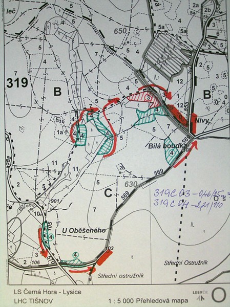 Porost je předán zástupci (mistrovi) smluvního partnera zadávacím listem se situačním plánkem porostu. Tento zobrazuje zadané porostní skupiny uvedené v zadávacím listu, tj. cesty či svážnice, po kterých se bude přibližovat a dále místa určená pro skladování dříví. Tyto situační plánky porostů má každý operátor. Jelikož většina porostních skupin se skládá z více částí, operátor se tak pomocí plánku v porostech lépe orientuje /obr.4/. Obsluha vyvážečky dle náčrtu v mapě popisuje vyvezené hráně dle jednotlivých porostních skupin /obr.5/.