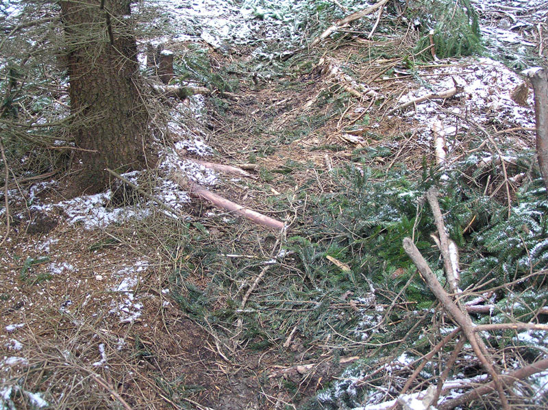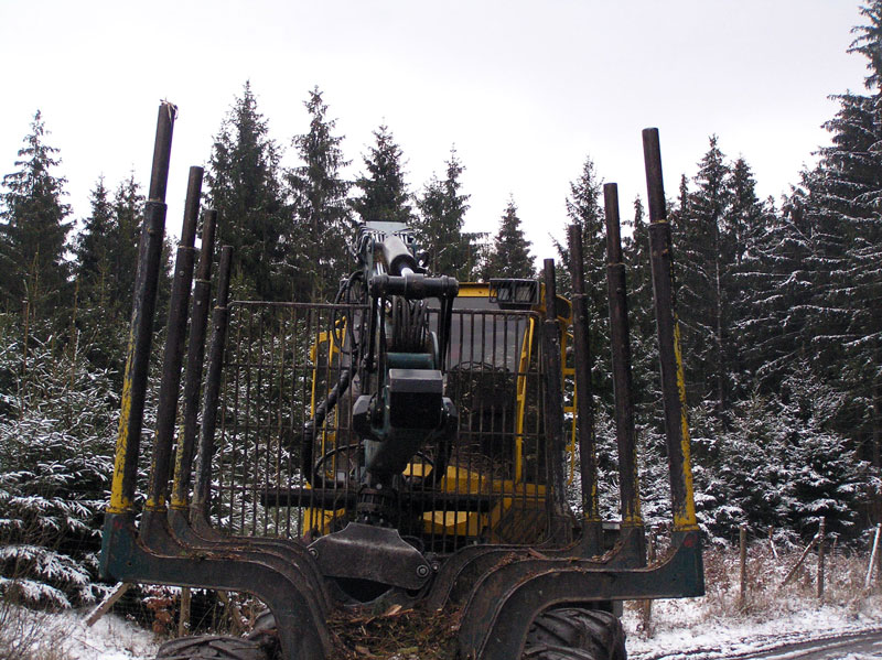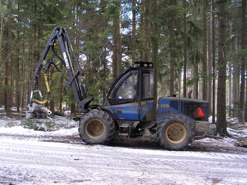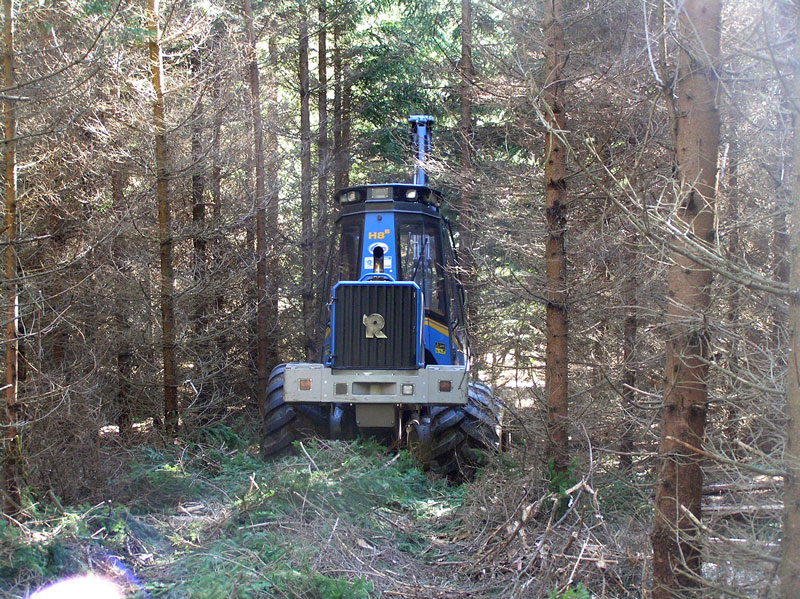 Harvestorový uzel, který byl letos na mém revíru, se skládá ze dvou malých harvestorů Rottne H8 /obr.6/ a malé vyvážečky HSM 208 F /obr.7/. Z technických parametrů uvedu pouze dosah ruky harvestoru – což je 7 m, rozchod kol harvestoru – 220 cm, rozchod kol vyvážečky – 230 cm. Tento typ má nivelaci, což umožňuje kácení v členitějším terénu. Denní výkon harvestoru se pohybuje ve slabých probírkách (cca 30 a 40 let věku) v průměru 40 m3 a denní výkon vyvážečky je 80 – 100 m3. A nyní se dostávám ke zcela zásadní otázce technologie, a to jsou škody způsobené na porostu. Šířka linek v porostech je 3,5 – 4,0 m. Díky uvedenému rozchodu kol strojů a díky důslednému kladení klestu do kolejí (80 % – 90 % celkového objemu) /obr. 8/, jsem musel při následném přebírání jednotlivých porostů konstatovat, že škody na porostech jsou minimální.
