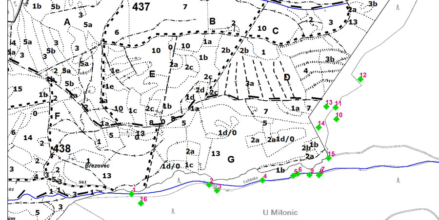 Další fáze pátrání proběhla v terénu. S ohledem na současnou podobu porostů na obou březích hraničního toku, především k listnatým mlazinám z přirozené obnovy na poměrně bohatém stanovišti, bylo nutno vyčkat na předjaří, kdy jsme předpokládali lepší podmínky pro hledání dochovaných hranečníků. A povedlo se, v korytu potoka jsme kamenné hranečníky s čísly shodnými s mapou opravdu nalezli. Některé byly vyvrácené, ale byly tam!