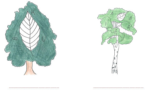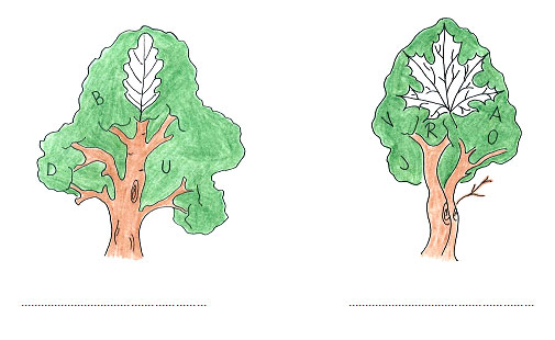 V koruně každého stromu jsou ukryta písmenka. Složte z nich správné názvy stromů. Jako nápověda Vám můžou sloužit nakreslené listy.