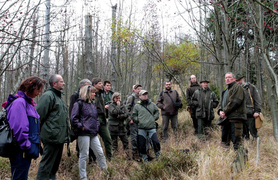Účastníci odpolední venkovní pochůzky nejprve vystoupili horskou klenovou bučinou na vrchol Bukovce (1 005 m n. m.). Místní revírník Lesů ČR Ing. Pavel Lánský názornými ukázkami jen potvrdil, že jeřáb ptačí je perspektivní dřevinou pro zvýšení porostní druhové diverzity lesů Jizerských hor. Zatímco Ing. Ivan Kuneš odborně vysvětloval na jižním úpatí Jizerského hřbetu základní principy prosadbových a podsadbových center k vnášení listnaté příměsi a jedle do jehličnatých porostů hor, nad hlavami posluchačů se ozvaly první hlasy táhnoucích severských kvíčal. Po chvíli se celé hejno ptáků jakoby symbolicky sneslo do korun bohatě plodících jeřábů na úpatí Bukovce.