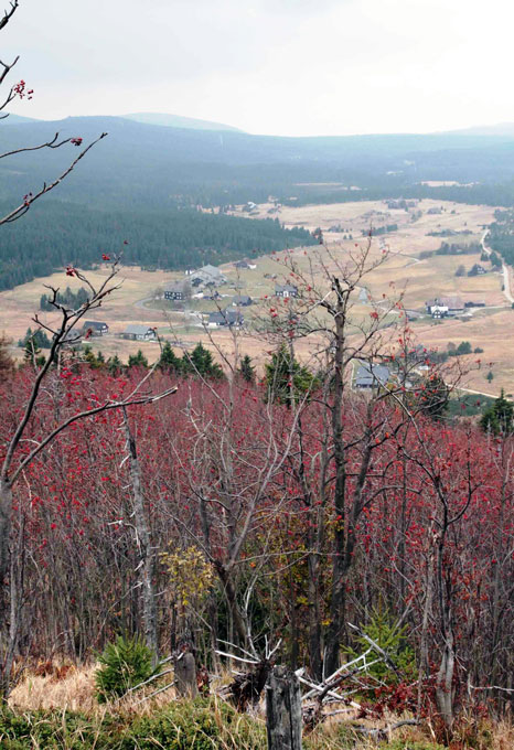 - Rudé plody jeřábů na západním svahu Bukovce dokreslují podzimní náladu hor; v pozadí osada Jizerka.