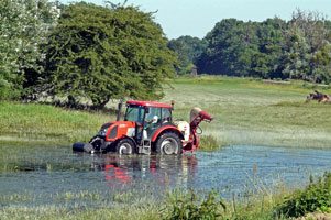 Popis úvodní fotografie: Ošetření vodních ploch s komářími larvami pomocí rosiče neseného na traktoru