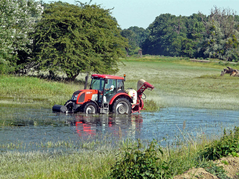 Popis úvodní fotografie: Ošetření vodních ploch s komářími larvami pomocí rosiče neseného na traktoru