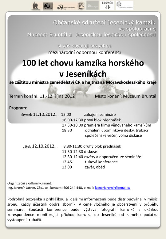 Občanské sdružení Jesenický kamzík ve spolupráci s Muzeem Bruntál a Jesenickou lesnickou společností si Vás dovolují pozvat na mezinárodní odbornou konferenci „100 let chovu kamzíka horského v Jeseníkách“