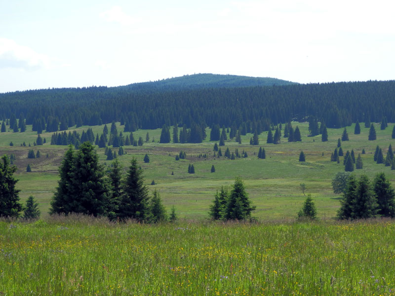 Velkou většinu lesů lokality lze zahrnout do biotopu Podmáčené smrčiny, které v nejvyšších polohách a na skeletových stanovištích přecházejí do biotopu Horské třtinové smrčiny. Najdeme je například na Kraslickém Špičáku a na plochých vrcholcích Přebuzi, kde ve stromovém patře dominuje smrk ztepilý (Picea abies) a v bylinném patře je hojně zastoupena ostřice obecná (Carex nigra), suchopýr pochvatý (Eriophorum vaginatum), psineček psí (Agrostis canina), dále se vyskytuje třtina chloupkatá (Calamagrostis villosa), přeslička lesní (Equisetum sylvaticum), viola bahenní (Viola palustris) a sedmikvítek evropský (Trientalis europaea). V mechovém patře dominují rašeliníky (Sphagnum spp.) a ploník obecný (Polytrichum commune).