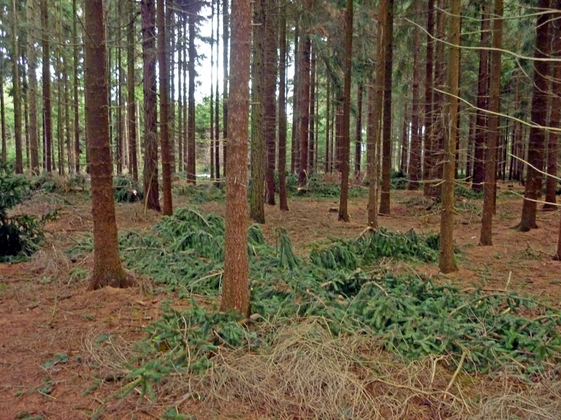 Způsob a rozsah poškození porostů byl odlišný. Škody vznikly bez ohledu na stanovištní podmínky a dřevinnou skladbu. Poškozené byly smrkové monokultury, borové mlaziny, ale i listnaté porosty. U listnatých porostů mělo zásadní vliv na poškození nasycení nezamrzlé půdy vodou. Smrk byl poškozen vrcholkovými zlomy především ve starších porostech. Zlomením vrcholů vzniká škoda ztrátou přírůstu a zhoršením kvality kmene, neboť dřevo v místě zlomu bývá napadeno hnilobou. Borovice byla nejvíce poškozena v mlazinách a tyčkovinách, kdy byly celé porosty vyvráceny nebo ohnuty pod tíhou ledovky. Nejvíce překvapující byl rozsah a způsob poškození listnatých porostů, kdy se většina dřevin ukázala spíše jako meliorační než zpevňující. Listnaté porosty byly v menším množství rozlámané, ve větší míře však vyvrácené. Převaha vývratů v dubových i bukových porostech postrádá logiku. Porosty byly založeny kvalitním sadebním materiálem na vhodném stanovišti a řádně vychovávané.