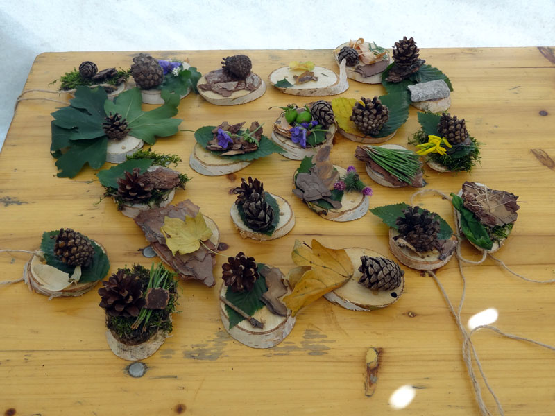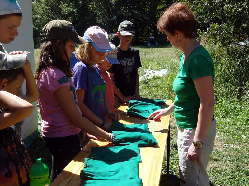 Vzhledem k tomu, že jsme pracovali s dětmi všech věkových kategorií v rámci ZŠ, tj. 6 – 15 let, rozdělili jsme je na skupiny, aby mohl být výklad i případná diskuze přizpůsobeny věkovým kategoriím. Pro zpestření celé akce jsme dětem předvedli čtyřnohého kamaráda, německého ohaře, a jeho způsob využití v myslivecké praxi. Poté táborníci soutěžili v osmi věkově smíšených skupinkách a poměřili své síly a znalosti v disciplínách jako byly hmatové poznávání přírodnin, poznávání stop, poznávání dřevin a plodů, v Kimově hře – procvičování zrakové paměti a v hodu na cíl. Pro kreativní činnost jsme zvolili výrobu dřevěných medailonků na krk, kdy si děti nasbíraly přírodniny a pomocí smirkového papíru a lepidla si dotvořily pěknou vzpomínku dle své fantazie a vkusu.