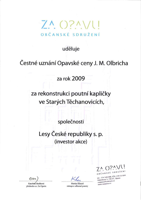 „Porota hodnotí úpravu jako příkladný postup záchrany a obnovy drobné architektury v krajině,“ uvádí se v tiskové zprávě občanského sdružení Za Opavu, které odbornou soutěž s názvem Opavská cena J. M. Olbricha organizuje.