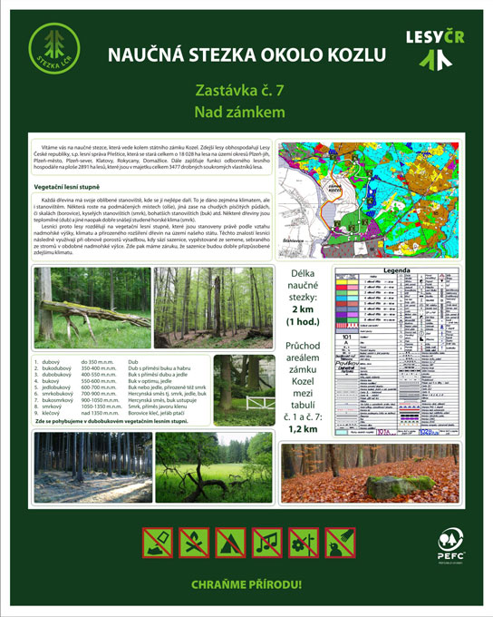 Lesy ČR otevřely v lesích u známého západočeského zámku Kozel zcela novou naučnou stezku. Návštěvníci vůbec nejoblíbenější památky Plzeňského kraje, zámku Kozel v obci Šťáhlavice, se mohou projít po nové naučné stezce s názvem Okolo Kozlu. Je dlouhá dva kilometry a vede místními lesy. Naučná stezka zvýši atraktivitu lokality a přispěje k dalšímu rozvoji turistického ruchu v regionu.
