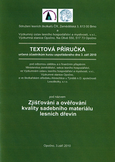 Textová příručka určená účastníkům kurzu (Opočno a Albrechtice u Týniště nad Orlicí, 3. 9. 2010), který pořádaly Sdružení lesních školkařů ČR, Brno, a Výzkumný ústav lesního hospodářství a myslivosti, v.v.i., Výzkumná stanice Opočno, s finančním přispěním Ministerstva zemědělství ČR, úseku lesního hospodářství. Cílem kurzu bylo seznámit technické pracovníky zaměstnané ve školkařských provozech s aktuálními požadavky na kvalitu sadebního materiálu lesních dřevin a na konkrétních případech demonstrovat správné používání metod zjišťování normou stanovených morfologických a fyziologických parametrů. Součástí kurzu byly i ukázky biologicky vhodného pěstování krytokořenného sadebního materiálu a možnosti eliminace deformací kořenů.