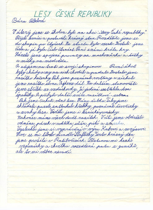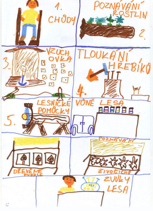 Šli jsme lesem a plnili různé úkoly. Chodili jsme na chůdách, stříleli ze vzduchovky, poznávali jsme les. Jeho vůni, listy, zvířata, zvuky, skládali jsme obrázky listů ze dřeva a říkali, co mají stromy za plody.