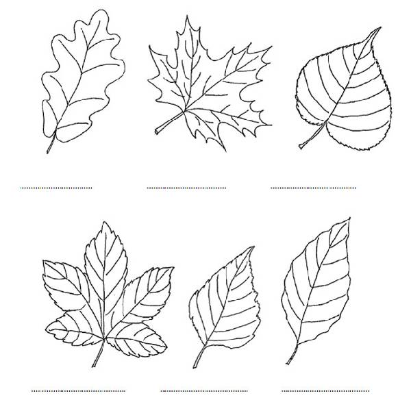 1. Vybarvěte každý list a připište název, ze kterého stromů listy pocházejí: