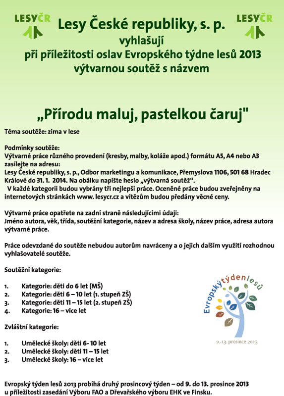 Při příležitosti oslav Evropského týdne lesů 2013 vyhlašují Lesy České republiky, s. p. výtvarnou soutěž na téma „zima v lese“.