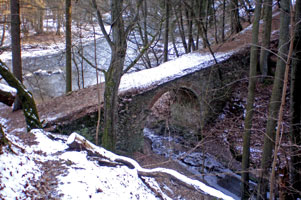 Již podél řeky Oslavy se dostáváme na zarostlou loučku s mnoha kaštany „tzv. Kaštanka“. Po opuštění loučky dojdeme k mohutným skalám, pod kterými přicházíme k Čertovu mostku. Jedná se o románskou stavbu s jedním segmentově zaklenutým obloukem, překonává přítok Oslavy, potok příhodně nazvaný Hučák. V okolí mostku jsou k vidění vodopádky a malebná přírodní scenérie. Odtud stoupáme lesní cestou a po levé ruce stojí žulový pomníček, jež připomíná smrt hajného Karla Czepla, který zde byl 9. července 1842 zastřelen pytláky.