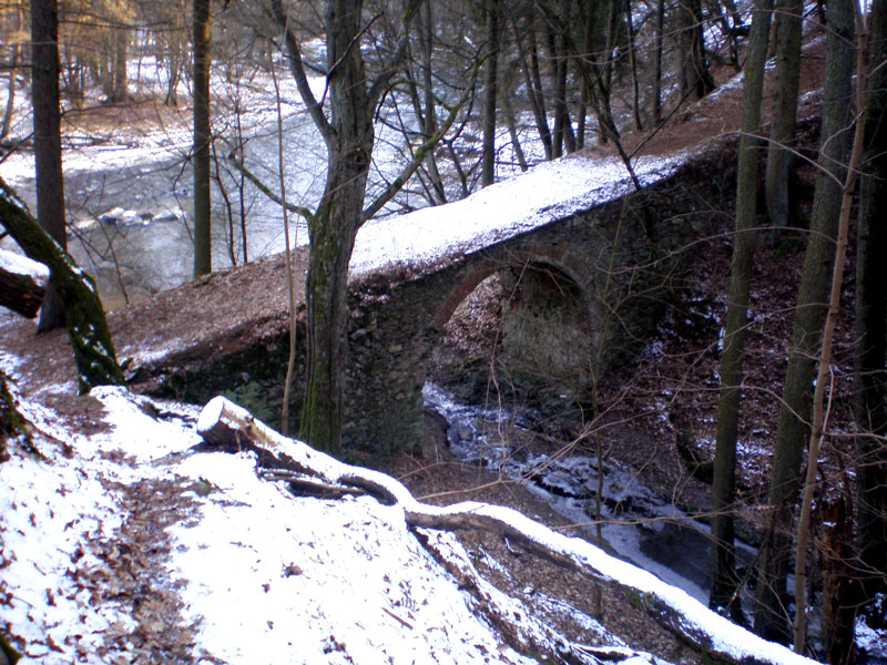 Již podél řeky Oslavy se dostáváme na zarostlou loučku s mnoha kaštany „tzv. Kaštanka“. Po opuštění loučky dojdeme k mohutným skalám, pod kterými přicházíme k Čertovu mostku. Jedná se o románskou stavbu s jedním segmentově zaklenutým obloukem, překonává přítok Oslavy, potok příhodně nazvaný Hučák. V okolí mostku jsou k vidění vodopádky a malebná přírodní scenérie. Odtud stoupáme lesní cestou a po levé ruce stojí žulový pomníček, jež připomíná smrt hajného Karla Czepla, který zde byl 9. července 1842 zastřelen pytláky.