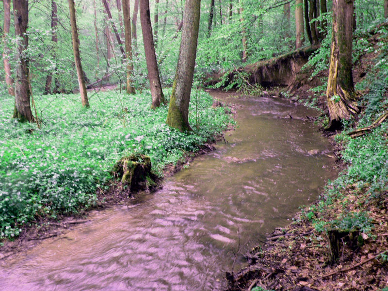 Motorizovaní výletníci mohou zaparkovat auto u koupaliště, kde se lze v parném létě osvěžit. Několik minut chůze po proudu potoka stojí Hlavatův mlýn. První zprávy o této samotě pochází z roku 1674, přičemž mlýnský provoz byl ukončen v r. 1894. Potok v údolí začíná tvořit meandry, přes první tři přejdete po můstcích až k samotě, jedná se o bývalý mlýn Bábovec. Nejstarší dochované písemné záznamy jsou z r. 1628 a jeho dnešní obyvatelé jsou proslulí nebývalou dlouhověkostí. Na místní louce bývá také o letních prázdninách dětský tábor. Za loukou již nejsou meandry potoka přemostěny, a pokud náhodou protéká více vody, není snadné potok překonat a procházka údolím může nabýt nečekaně sportovního rázu. Zvláště, potkáte-li motorkáře nebo čtyřkolkáře, úspěšně ničící nádherné údolí. Na pravém břehu, vysoko na strmém svahu jsou zbytky hrádku Lapikus.