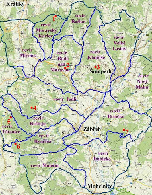 Popis k mapce: 1. U Sv. Trojice; 2. Žďár; 3. Senová; 4. Borová; 5. Cukrová bouda; 6. Malá huba; 7. nad Rohelskou boudou;
