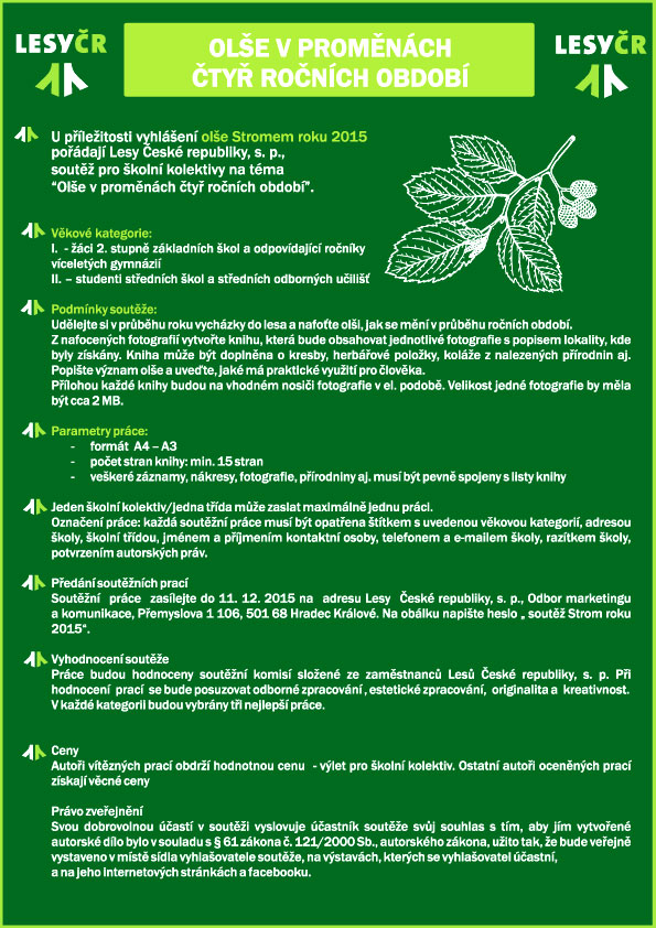 U příležitosti vyhlášení Olše stromem roku 2015 pořádají Lesy České republiky, s. p. soutěž pro školní kolektivy na téma „Olše v proměnách čtyř ročních období“.
