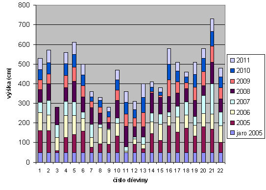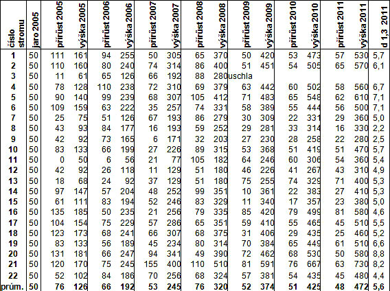 Tabulka zachycuje roční přírůsty a celkovou výšku (v cm) 22 třešní od výsadby až do roku 2011.
