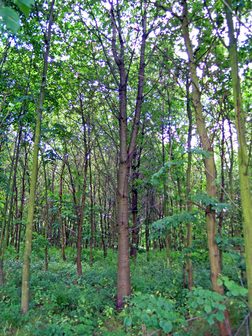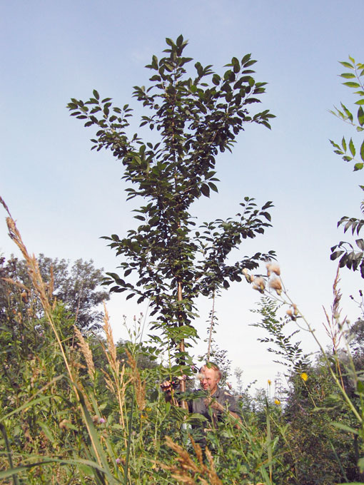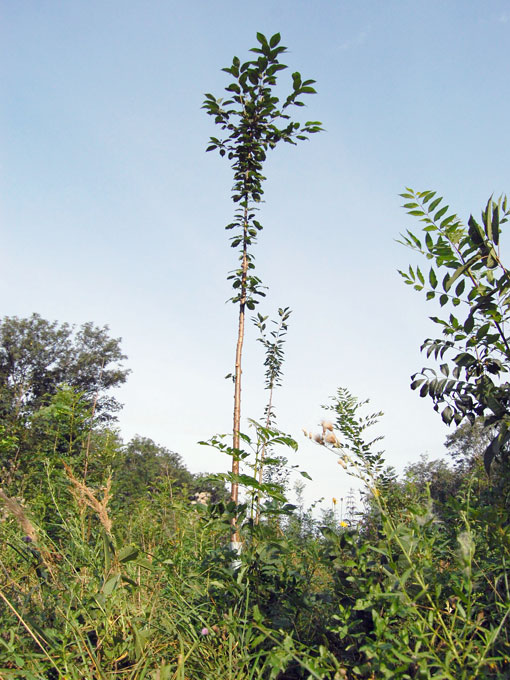 - u nevyvětvovaných jedinců (pár kusů) se bohatě tvoří koruna, většinou s více dominantními výhony, které v daných podmínkách bez výchovné dřeviny nedávají záruku průběžného kmene, dochází k menšímu výškovému přírůstu, který je nahrazen značným přírůstem tloušťkovým;