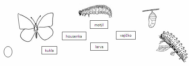 4. Spojte správné názvy vývojových stádií motýla s příslušným obrázkem a přiřaďte k nim čísla podle pořadí, v jakém jdou při vývoji za sebou: