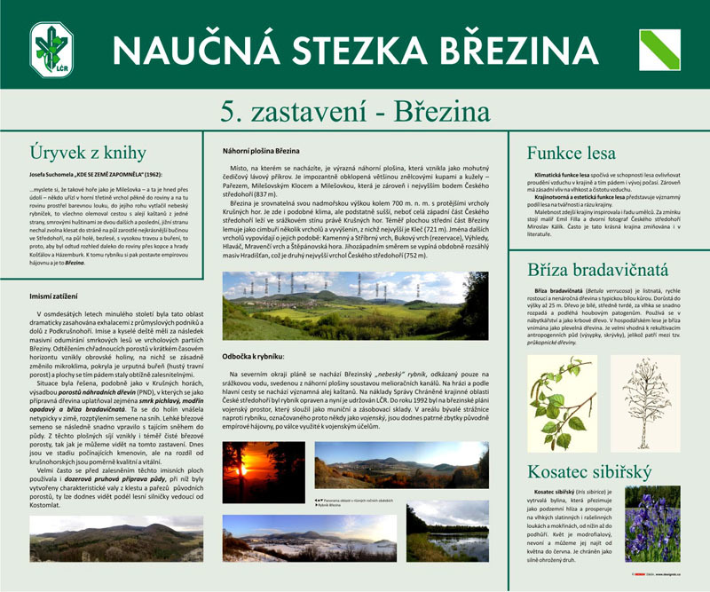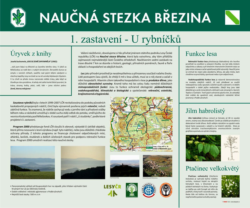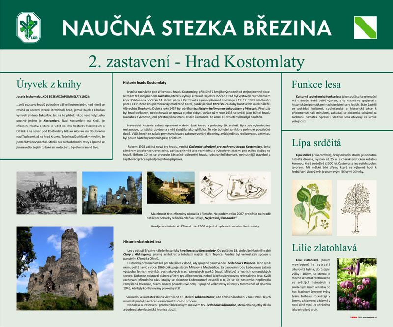 Naučná stezka prochází dvěma okresy (TP, LT), je okružní, začátek a konec stezky je v lokalitě u rybníčků pod hradem Kostomlaty.