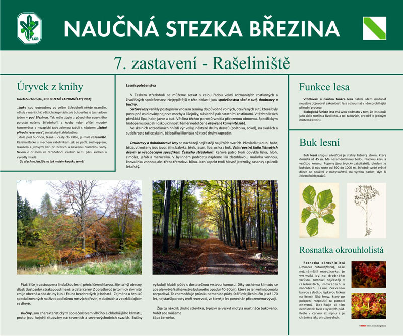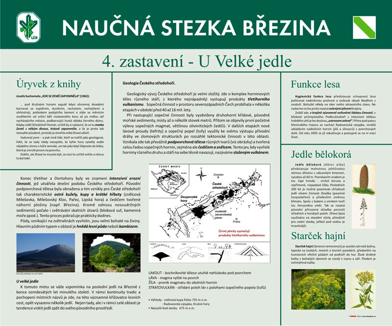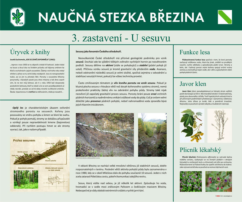 Na stezce je neznačená odbočka na hrad Kostomlaty (300m) a značená odbočka k Vojenskému rybníku (500m). Nastoupit na stezku lze kdekoli, kde navazuje turistické značení KČT. 3. zastavení Sesuv je přímo u paty činného sesuvu, průchod kolem něho vyžaduje zvýšenou opatrnost, výhledově budou zhotoveny dřevěné chodníky okolo sesuvu.