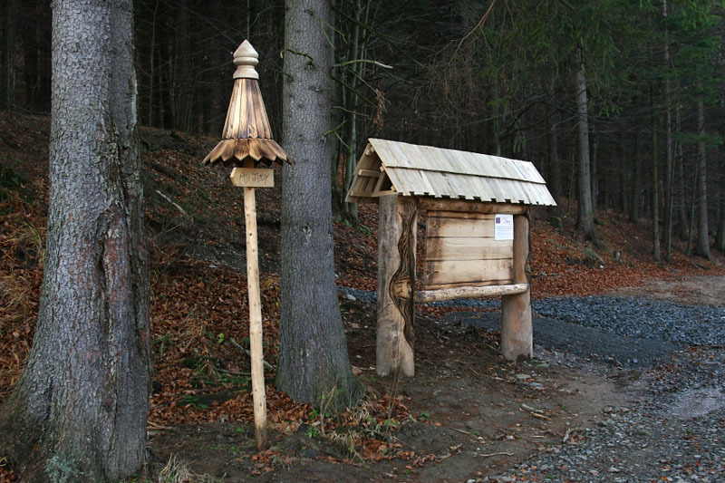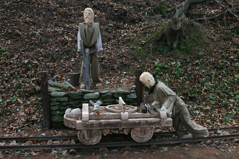 Pět dřevěných figurín a informační tabule Vám přiblíží práci dřevařů, kteří jen pomocí pil a seker prováděli kácení a odvětvování stromů.