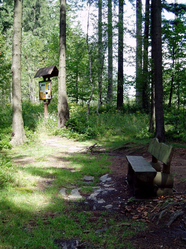 Součástí stezky jsou dřevěné lavice, kamenný stůl a zmíněný přístřešek s další info tabulí a pítkem znázorňujícím rozmoří.