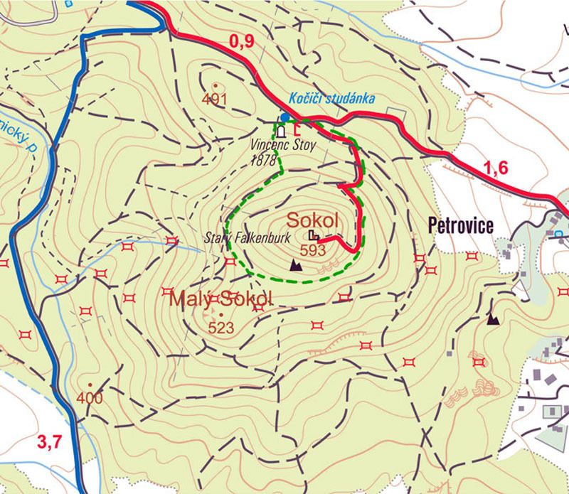 Z naučné stezky je možné odbočit k vrcholu Sokola (593 m n.m.), kde se nachází zřícenina hradu Starý Falkenburk; na trase naučné stezky se nachází zastavení u pomníčku Vincenta Stoye (k památce úmrtí lesního adjunkta), který byl v rámci výstavby naučné stezky zrestaurován.