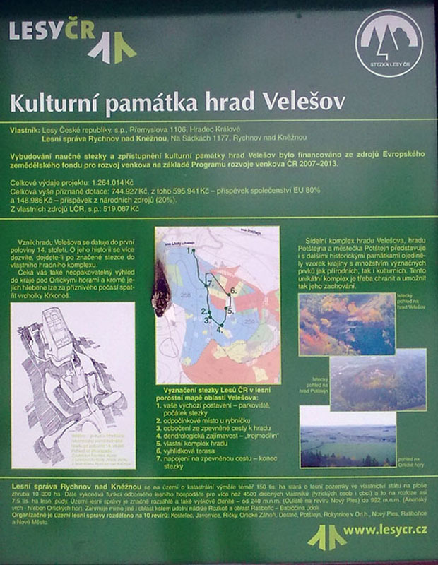 Naučná stezka s mnoha zajímavostmi a 5 zastaveními. Na turisty čeká mimo jiné kulturní památka hrad Velešov nebo neopakovatelný výhled do kraje pod Orlickými horami.