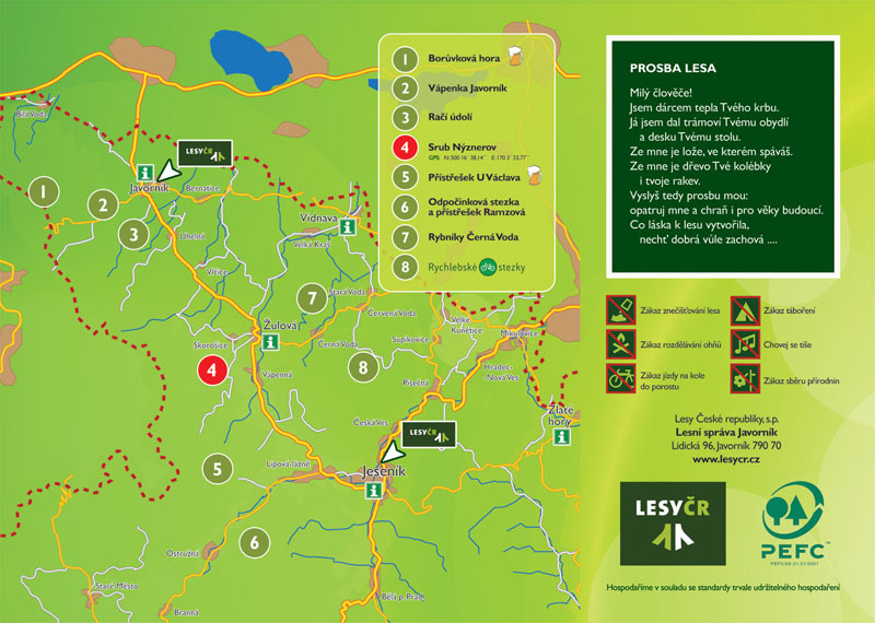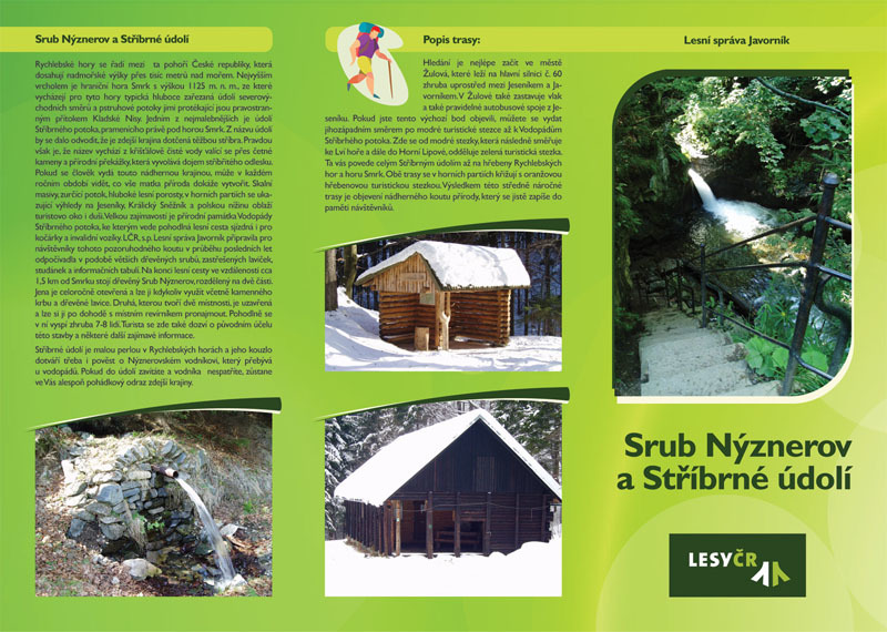 Trasa údolím Stříbrného potoka – vodopády, výhledy, klidné lesní prostředí. Po trase informačně – naučné tabule, odpočivné sruby.