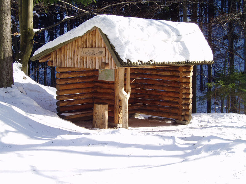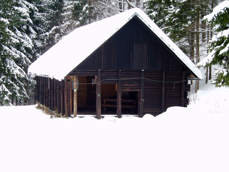 Největší Srub Nýznerov – otevřená část s posezením a krbem. Uzavřenou část chaty pro pobyt cca 8 osob lze od LČR pronajmout.
