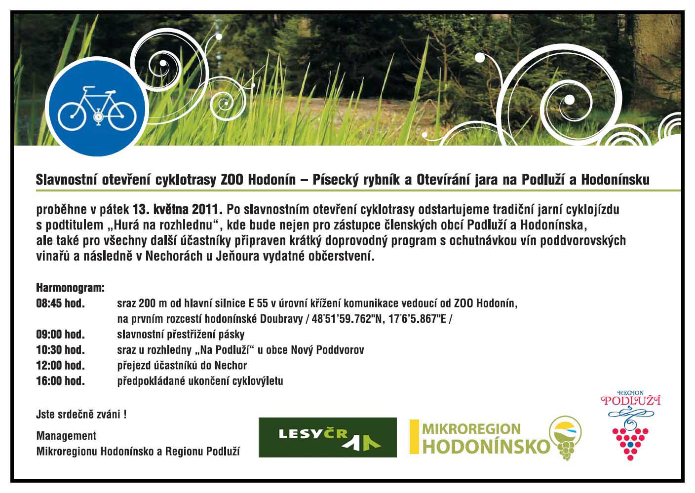 Lesy ČR při této příležitosti zvou zástupce médií i širokou veřejnost na slavnostní otevření cyklotrasy ZOO Hodonín – Písecký rybník. Souběžně proběhne akce Otevírání jara na Podluží a Hodonínsku. Vše proběhne v pátek 13. května 2011.