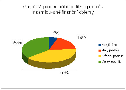 Pokud se týká nasmlouvaných finančních objemů, opět připadá nejvíce na střední podniky (40 %), následují podniky velké se 36 % a malé s 18 % (6 % nezjištěno), viz graf č. 2. Kritika, že jsou jednoroční tendry šity na míru pouze „několika“ velkým firmám, se tak ukázala být zcela neopodstatněnou.