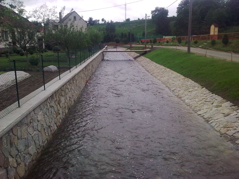 „Stavební práce v předmětném úseku spočívaly v rozšíření koryta vodního toku a vybudování levobřežní opěrné zdi. Pravý břeh zpevnila kamenná dlažba zasazená do betonu s následným vysvahováním a osetím travou. Dno jsme vyskládali kamennou rovnaninou a zajistili přeložení stávajících inženýrských sítí,“ popisuje průběh stavebních úprav Miroslav Kahánek, vedoucí Správy toků Lesů ČR-oblast povodí Dyje, která celou akci organizačně zajišťovala.