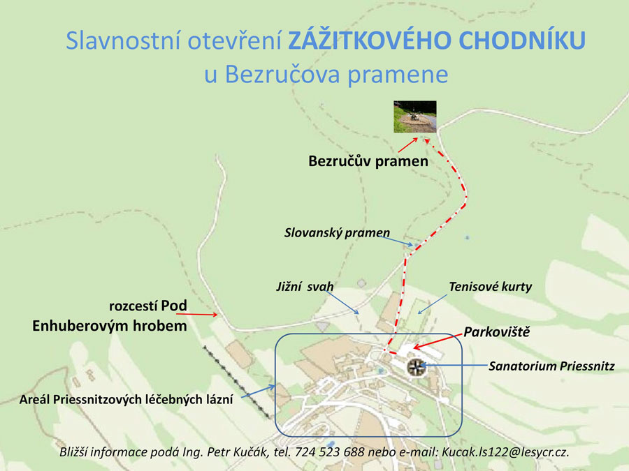 Lesy České republiky, s. p., spravují také lesní porosty v okolí lázeňských míst. I v těchto lesích se podnik snaží průběžně podporovat a rozvíjet veřejně prospěšné funkce lesů a to v souladu se svým „Programem 2020 – zajištění cílů veřejného zájmu u LČR“. V této souvislosti Lesy ČR v těchto dnech u známého lázeňského Bezručova pramene v lázních Jeseník v Olomouckém kraji dokončily za skoro půl milionu korun výstavbu zcela nového Zážitkového chodníku a opravu několika lázeňských pramenů. Všechny aktuálně provedené úpravy se nacházejí na pozemcích, které Lesy ČR spravují. Slavnostní představení dokončených akcí veřejnosti se uskuteční tento pátek 27. června 2014, od 15.30 hodin.