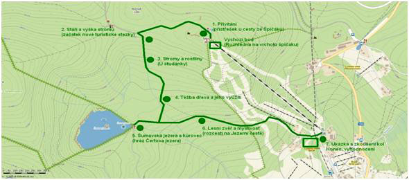 Podrobná mapka naučné stezky s vyznačením jednotlivých stanovišť a stručný popis, co návštěvníky na každé ze sedmi zastávek čeká: