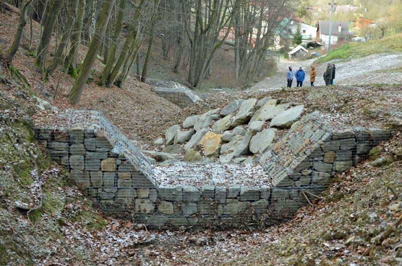 V obci Hvozdná byly na levobřežním přítoku Hvozdenského potoka vybudovány tři příčné objekty. Práce skončily v prosinci. Základem drátokamenných přehrážek vyskládaných z typizovaných drátokošů neboli gabionů je vodostavební železobeton. Břehy pod přehrážkami zpevnila metrová vrstva z lomového kamene. „Pod spadištěm je filtrační vrstva a ve dnu koryta přechodový kamenný zához,“ uvedl Pavel Pernica z Lesů ČR, vedoucí správy toků, oblast povodí Moravy. Stavba stabilizovala koryto potoka, zabraňuje erozi lesní půdy a zachycuje splaveniny, které se dříve dostávaly až do intravilánu obce Hvozdná.