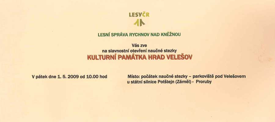Sídelní komplex hradu Velešova, nedalekého známějšího hradu Potštejna a městečka Potštejna spolu s dalšími historickými památkami a řekou Divokou Orlicí tvoří ojedinělý typ krajiny s množstvím přírodních, historických i kulturních zajímavostí. Realizací popisovaného projektu přispívají Lesy České republiky k podpoře rekreační funkce lesů v turisticky přitažlivé oblasti. Je to součást firemní strategie rozvoje mimoprodukčních funkcí lesa a péče o les jako o prostor pro nejrůznější veřejné aktivity. Ve prospěch veřejného zájmu v lesích vynakládá státní podnik Lesy České republiky kolem 300 milionů korun ročně.