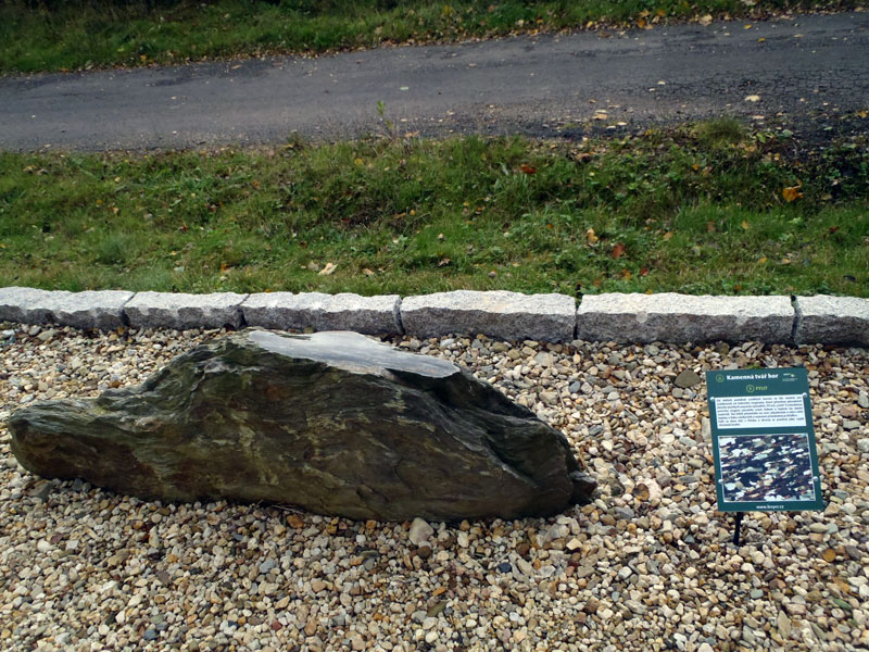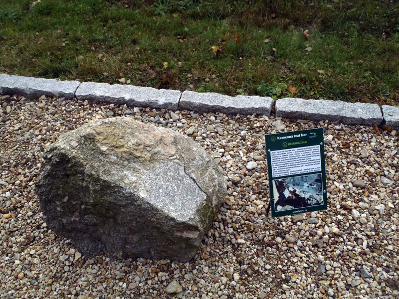 Nejstarší horninu na geologické stezce představuje žula, jednotlivé kameny jsou na vršku vybroušeny, aby byla detailně vidět jejich struktura.